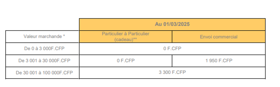 - Les envois non commerciaux (de particulier à particulier, en cadeau) sont taxés à partir de 30.001F CFP (Montant de la marchandise + fret).